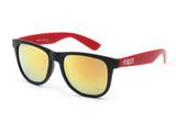 A playfully plucky design. The dual-colored frame brings a touch of fun and vivacity to this traditionally serious look. Features richly colored mirrored lenses made from scratch-resistant polycarbonate which provide 100% protection from harmful UV rays.