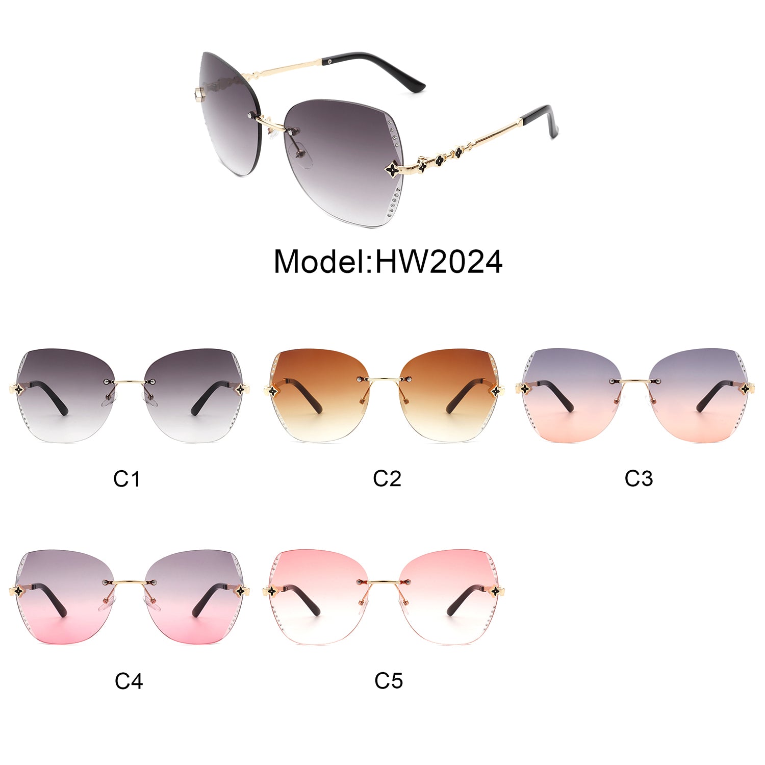 HW2024 - Oversize Rimless Butterfly Shape Tinted Rhinestone Fashion Sunglasses